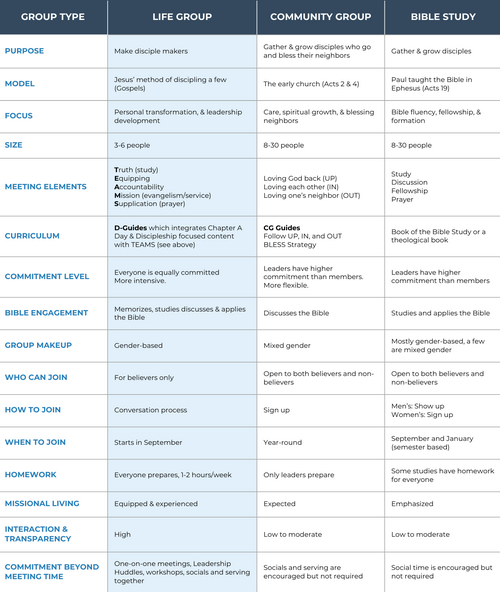 God uses all three of these groups to help disciples grow at Bay Area. You have some great options to prayerfully consider. Here are some helpful descriptors to better understand the differences between the three options.